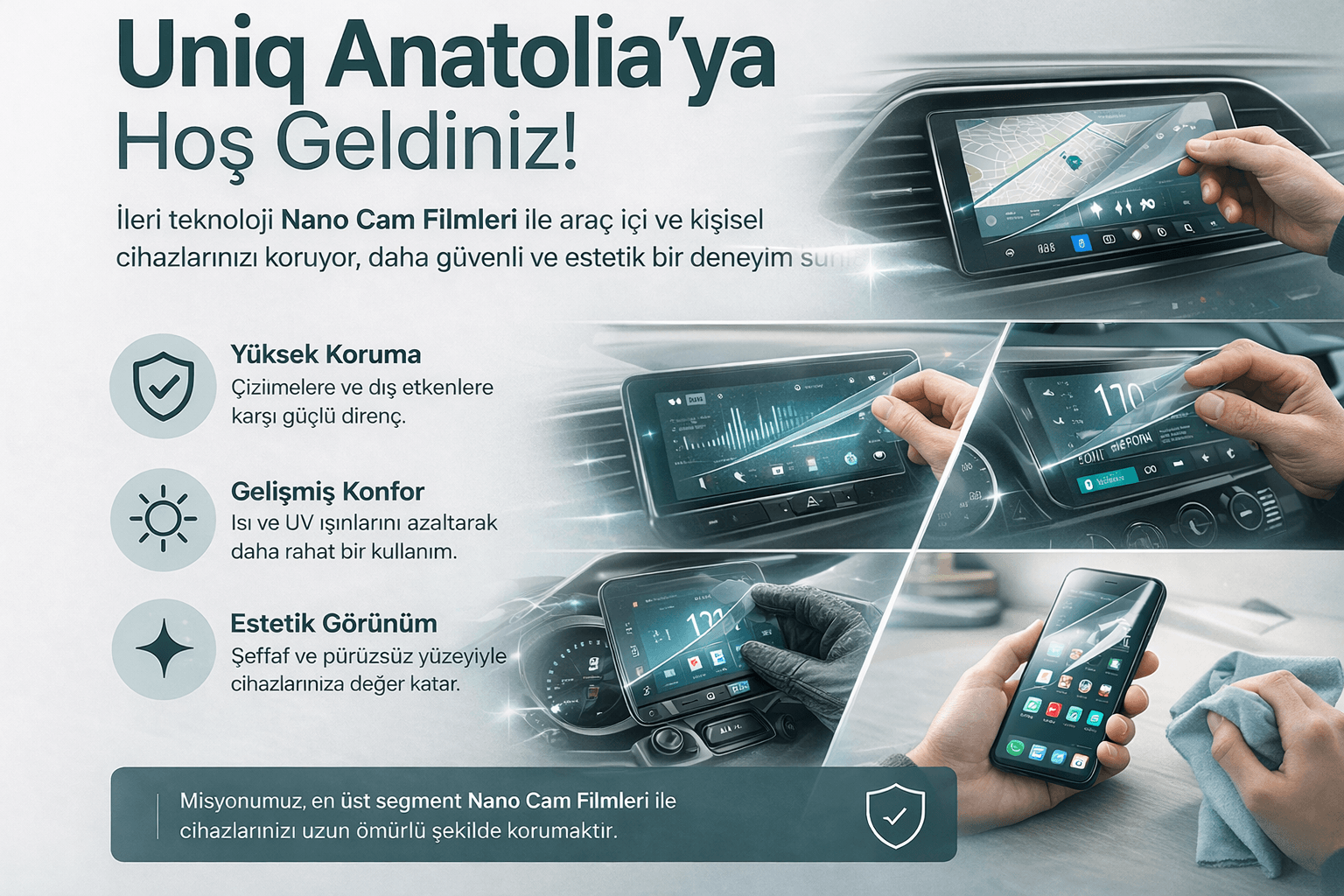 Uniq Anatolia’ya hoş geldiniz; burası inovasyonun yüksek koruma standartlarıyla buluştuğu yer! Bizler, ileri teknoloji yüzey koruma çözümlerine tutkuyla bağlı bir ekibiz. Misyonumuz, dünyayı algılama biçiminizi değiştiren, en üst segment Nano Cam Filmleri ve milimetrik hassasiyete sahip Lazer Kesim hizmetleri sunarak değerlerinizi koruma altına almaktır.